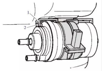 · 濾清器殼體上的銷釘2 必須嵌入濾清器支架上導(dǎo)向件的凹口1 中。
