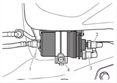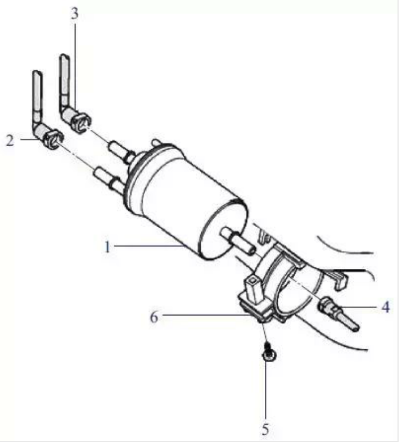 1—燃油濾清器;2—燃油供油管路(黑色,來(lái)自燃油箱);3—燃油回油管路(藍(lán)色,連接燃油箱);4—燃油供油管路(黑色,到發(fā)動(dòng)機(jī));5—螺栓;6—支架(用于支撐燃油濾清器)