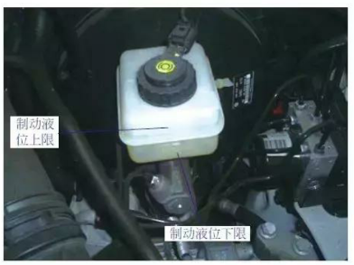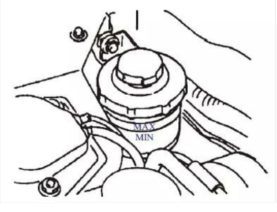 如下圖所示, 檢查制動(dòng)液液面是否位于儲(chǔ)液罐的MAX 和MIN 標(biāo)記之間。如果大于MAX,則可能是制動(dòng)液加注過(guò)多;如果小于MIN,則可能是制動(dòng)系統(tǒng)某部分發(fā)生滲漏所致。此時(shí)應(yīng)仔細(xì)檢查制動(dòng)系統(tǒng)是否存在滲漏現(xiàn)象,之后再將制動(dòng)液加注到標(biāo)準(zhǔn)范圍。