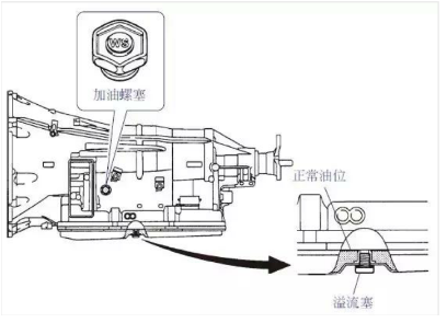 如下圖所示,從溢流塞處進(jìn)行檢查(這種自動(dòng)變速器本身不帶油尺,也沒(méi)有油尺導(dǎo)管,但有加油螺塞,有的則須從溢流塞孔處加注自動(dòng)變速器油)。