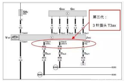 另,自2008 年10 月起,途安方向機(jī)由第二代切換到第三代,兩者主要區(qū)別為第三代方向機(jī)轉(zhuǎn)向角度傳感器G85 是安裝在方向機(jī)上的,原5 針插頭T5b 替換為3 針插頭T3ax,見(jiàn)下圖。