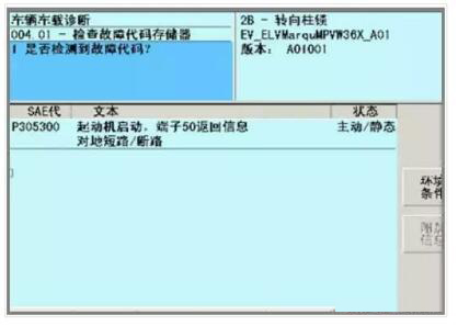 儀表中轉(zhuǎn)向黃燈報(bào)警。2B 控制單元中有故障碼:P30530 起動(dòng)機(jī)啟動(dòng),端子50 返回信息對(duì)地短路/斷路 主動(dòng)/靜態(tài)。