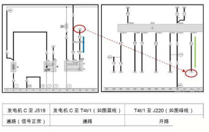 4、查閱電路圖,測(cè)量發(fā)電機(jī)到發(fā)動(dòng)機(jī)控制單元之間的信號(hào)線,電阻無(wú)窮大,線束斷路。(見(jiàn)下圖)