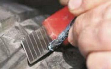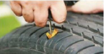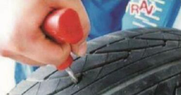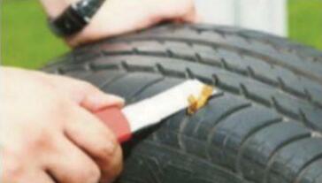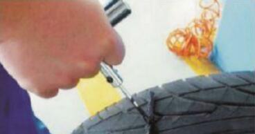 ② 處理扎孔 使用錐形銼,插入車胎被扎出的孔中,來回抽動數(shù)下。目的是將孔的創(chuàng)面銼出毛茬,以便插入膠條后能嚴(yán)密結(jié)合。
