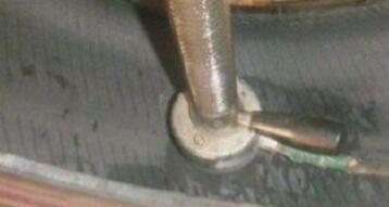 ④ 拔出工具 將錐子從車胎中拔出。拔出時動作要很慢,以保證在拔出錐子的同時,能把原先已進入胎中的膠條再帶出兩股。