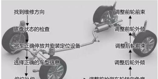 在轎車四輪定位數(shù)據(jù)修正與調(diào)整中,以主銷后傾角、車輪外傾角和車輪前束為主要調(diào)整對象,在大多數(shù)情況下,一般只需調(diào)整前輪前束。如果有必要調(diào)整其他定位參數(shù),則應(yīng)遵循圖12所示的四輪定位調(diào)整順序。