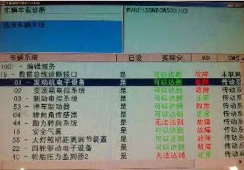 建議應(yīng)先用電腦檢測(cè)儀檢測(cè)車輛控制系統(tǒng),這是較快捷的辦法。據(jù)悉,在發(fā)動(dòng)機(jī)啟動(dòng)后,檢測(cè)車輛有多個(gè)控制單元均有故障(圖4),在車載診斷識(shí)別窗口中,甚至還莫明其妙地出現(xiàn)“車輛系統(tǒng)不存在”的提示,推斷應(yīng)與數(shù)據(jù)總線的共性故障有關(guān)聯(lián)。