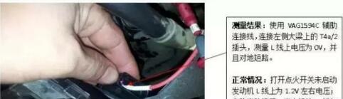 2、將發(fā)動(dòng)機(jī)熄火,拔下發(fā)電機(jī)上的 T2gc 插頭,打開(kāi)點(diǎn)火開(kāi)關(guān),用萬(wàn)用表測(cè)量 L 線,測(cè)得 L 線上電壓為 0V,并且對(duì)地短路;
