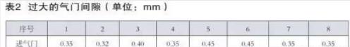 本著先簡單再復(fù)雜的思路,先看配氣正時,拆下正時皮帶看正時記號, 接下來檢查氣門間隙,分別轉(zhuǎn)到1-4缸壓縮上止點,檢查氣門間隙,如表1所示。標(biāo)準(zhǔn)的氣門間隙是:水溫在15°~25°的時候,進(jìn)氣門0.16~0.24mm,排氣門0.24~0.32mm。結(jié)果在意料之中,是因為氣門間隙過小,導(dǎo)致氣門漏氣,從而引起了缸壓不足,進(jìn)氣壓力過高。