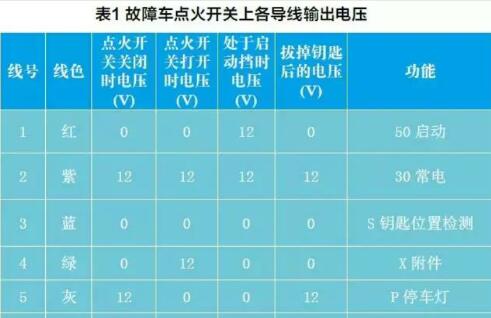 查閱故障車點火開關相關電路圖,用萬用表檢測點火開關上6根導線的輸出電壓如表1所示。