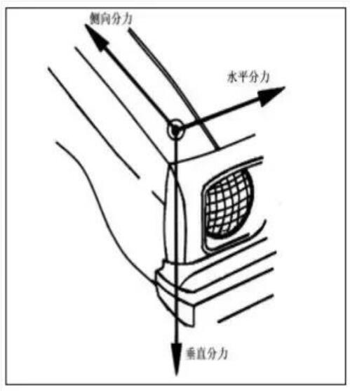 同樣的碰撞力,板件的棱角和邊緣剛性不同時(shí),碰撞后的 損傷情況也不同。當(dāng)剛性較小時(shí),棱角和邊緣損傷跡象雖比較明 顯,但當(dāng)能量通過(guò)附近的結(jié)構(gòu)逐漸消散時(shí)其損傷跡象反而很小。反之,棱角和邊緣損傷跡象雖很小,但當(dāng)能量傳遞至車(chē)身內(nèi)部很 深的部位產(chǎn)生比較嚴(yán)重的內(nèi)部損傷。