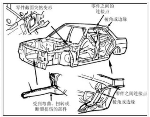 沿著碰撞力擴(kuò)散的路徑,按順序進(jìn)行檢查。檢查中要仔細(xì)觀 察板件的連接部位,零件的棱角和邊緣等,如圖4所示。