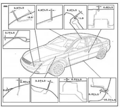 如圖6所示,車(chē)門(mén)、翼子板、發(fā)動(dòng)機(jī)罩、行李箱蓋等之間的 配合間隙都有一定的要求,通過(guò)觀察、對(duì)比或測(cè)量它們之間間隙 的變化可以判定哪些發(fā)生了變形。對(duì)比左右翼子板與發(fā)動(dòng)機(jī)罩的 間隙情況,可通過(guò)簡(jiǎn)單地開(kāi)關(guān)車(chē)門(mén)及觀察門(mén)的準(zhǔn)直來(lái)確定車(chē)身立 柱是否受到損傷。