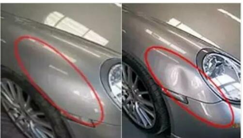 免漆凹陷修復(fù)技術(shù)是運(yùn)用光學(xué)、力學(xué)及化學(xué)等多方面技術(shù)原 理,對(duì)未損傷車(chē)漆的凹陷部位通過(guò)局部的特殊工藝進(jìn)行修復(fù),避 免了烤漆所造成的漆霧、流掛、色差、色變、桔皮等缺陷,無(wú)需 傳統(tǒng)的鈑金、噴漆就可以達(dá)到幾乎100%復(fù)原,如圖8所示。它操 作雖簡(jiǎn)單,但可以讓車(chē)輛恢復(fù)原有狀態(tài),極大縮短了修復(fù)時(shí)間, 具備傳統(tǒng)鈑金技術(shù)無(wú)法比擬的優(yōu)勢(shì)。但免漆凹陷修復(fù)存在一些缺 陷,例如,凹陷發(fā)生的部位不同,維修的難易程度也不同,個(gè)別 部位因內(nèi)襯和加強(qiáng)筋等問(wèn)題,導(dǎo)致維修難度過(guò)大,甚至需要破除 才能方便維修,也可能產(chǎn)生無(wú)法維修的情況。