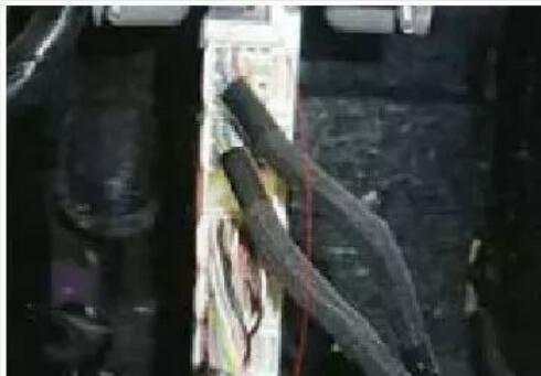 因?yàn)樵撔盘?hào)線由空調(diào)放大器控制 , 于 是 將 安 裝 在 右 前 雜 物 箱 后面的空調(diào)放大器拆下來(lái)檢查,首先測(cè)量該信號(hào)線,從后鼓風(fēng)機(jī)控制單元到空調(diào)放大器為接通的狀態(tài),拔下空調(diào)放大器上的插頭(如圖5所示),仔細(xì)檢查插頭內(nèi)部有少量的水跡,將空調(diào)放大器的所有插頭用酒精清理,然后用風(fēng)槍吹干,裝復(fù)再次檢驗(yàn)后空調(diào),鼓風(fēng)機(jī)恢復(fù)正常的工作,問(wèn)題解決。