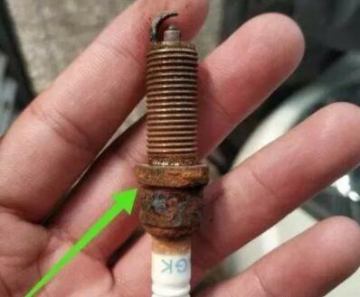 下圖所示,這就是上圖中的火花塞,箭頭所示的位置是工具拆卸的位置,銹蝕特別嚴(yán)重。并且,螺紋內(nèi)部也有很多鐵銹。再看點(diǎn)火中心電極,燒蝕也比較嚴(yán)重。根據(jù)這些情況,師傅建議車主拆卸四個(gè)火花塞,車主也在第一時(shí)間同意。