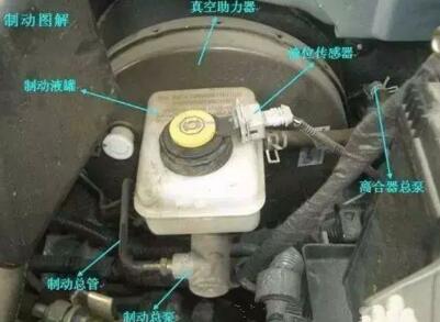 踩下離合踏板時,連接在踏板上的離合器總泵會動作,產(chǎn)生液壓力,沿管路傳遞到離合器泵上,最后轉(zhuǎn)化為機(jī)械力分離離合器。小F的離合器操作系統(tǒng)是液壓的,與制動系統(tǒng)共用一種液壓油,所以有一條管子連接到了制動液罐里。