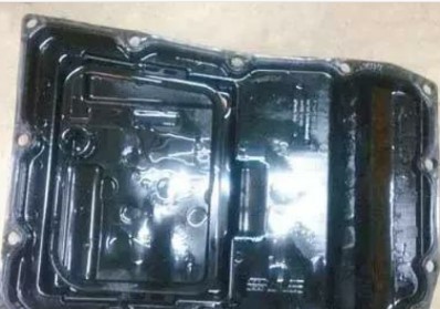 于是對(duì)變速器的濾清器進(jìn)行分析,變速器濾清器堵塞后影響最大的就是熱車后吸不上去油或油量不足而導(dǎo)致變速器離合器打滑,變速器的壓力源是油泵而輸出端是閥體上游濾清器,濾清器則是潤(rùn)滑油進(jìn)入油泵產(chǎn)生系統(tǒng)油壓最為關(guān)鍵的核心部件,如果熱車變速器濾清器堵塞變速器油泵造成抽油阻力加大,系統(tǒng)主油壓達(dá)不到標(biāo)準(zhǔn)要求導(dǎo)致離合器打滑,離合器的摩擦扭矩是正向油壓乘以摩擦系數(shù),因?yàn)樵谠O(shè)計(jì)中濾清器跟變速器油底殼是集成在一起的,拆下油底殼(如圖4 所示)即可對(duì)濾網(wǎng)進(jìn)行分解檢查,分解后發(fā)現(xiàn)濾網(wǎng)并沒有污染堵塞。