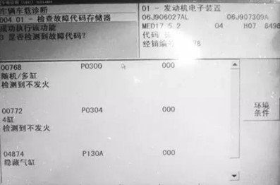 01 故障分析:?jiǎn)?dòng)發(fā)動(dòng)機(jī)時(shí)儀表EPC和OBD 燈常亮,怠速時(shí)無(wú)明顯抖動(dòng),但是慢慢加油時(shí)發(fā)動(dòng)機(jī)有明顯抖動(dòng),直至2000r/min左右時(shí)車輛抖動(dòng)不明顯。可能的故障原因包括進(jìn)氣量或噴油量不足、點(diǎn)火不良、缸壓過(guò)低等。