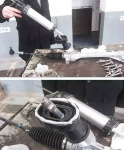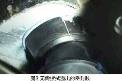 3. 待清潔部位干燥后,如圖2 所示,在新轉(zhuǎn)向機(jī)橡膠密封 圈處用打膠槍均勻、連續(xù)地打10mL 密封膠,密封膠體高度不低 于5mm。