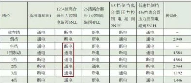 接著查閱各執(zhí)行元件的工作邏輯表,1~4擋的正常工作的主要離合器執(zhí)行元件是(1234擋離合器)(如表2紅色方框部分)。