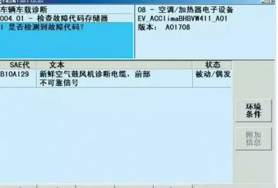 故障現(xiàn)象:自動空調(diào)間歇性停用,同時出現(xiàn)故障碼:B10A129 新鮮空氣鼓風(fēng)機診斷電纜,前部不可靠信號被動/偶發(fā)(如圖1所示),消除故障碼后空調(diào)恢復(fù)工作,但是一段時間后又停用,但不論空調(diào)是否停用,鼓風(fēng)機都能正常工作,并能對風(fēng)量大小進行調(diào)節(jié)。