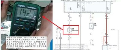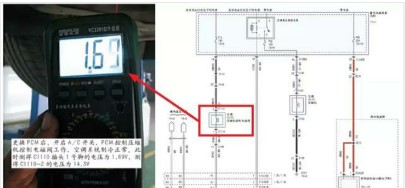 為了確認(rèn)是空調(diào)控制系統(tǒng)故障,還是執(zhí)行系統(tǒng)(離合器線圈及線路)故障,首先將壓縮機(jī)繼電器拔掉,使用跨接線直接短接繼電器3號(hào)腳和5號(hào)腳壓縮機(jī)電磁線圈執(zhí)行電路,此時(shí)壓縮機(jī)馬上吸合工作。同時(shí)經(jīng)檢測(cè),離合器繼電器及保險(xiǎn)絲正常、線路也沒(méi)有短路、斷路現(xiàn)象。其次檢查空調(diào)壓縮機(jī)排量控制電磁閥的相關(guān)線路,啟動(dòng)發(fā)動(dòng)機(jī)及開啟A/C開關(guān),測(cè)量電磁閥插接器C1110的1號(hào)腳及2號(hào)腳的電壓均為蓄電池電壓14.23V,這說(shuō)明電磁閥的供電線路正常,經(jīng)檢測(cè)從電磁閥C1110-1至PCM之間的線路也沒(méi)有短路、斷路現(xiàn)象。斷開C1110插接器測(cè)得電磁閥的電阻為15.8Ω,電磁閥沒(méi)有短路、斷路現(xiàn)象。通過(guò)以上的基本檢查說(shuō)明開啟A/C開關(guān)后,PCM沒(méi)有控制壓縮機(jī)離合器繼電器及壓縮機(jī)排量控制電磁閥工作。如圖3、圖4所示。