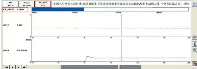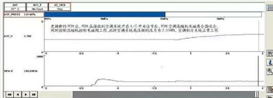 通過(guò)以上的檢測(cè),PCM控制壓縮機(jī)繼電器吸合及壓縮機(jī)排量調(diào)節(jié)電磁閥工作的所有條件已經(jīng)全部滿足,PCM依舊沒(méi)有做出相應(yīng)的指令,是否是PCM內(nèi)部控制電路故障?將相同配置正常車輛PCM調(diào)換到故障車輛,做好PCM編程及匹配好啟動(dòng)模塊后,啟動(dòng)發(fā)動(dòng)機(jī),開啟A/C開關(guān),壓縮機(jī)離合器吸合、壓縮機(jī)排量調(diào)節(jié)電磁閥工作,正常制冷,空調(diào)系統(tǒng)正常工作。如圖7所示。