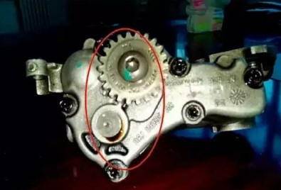考慮到該車已行駛18萬km,于是進(jìn)一步拆下油底殼對機(jī)油泵進(jìn)行檢測。拆下機(jī)油泵后用手轉(zhuǎn)動,感覺還是有壓力的。但當(dāng)檢查泵軸時發(fā)現(xiàn),用手推動齒輪時會有軸向跳動,可見存在軸向間隙。如果將出油口堵住轉(zhuǎn)動機(jī)油泵,油液會從泵軸間隙中涌出,從而造成泄壓(圖2)。同時,齒輪軸的軸向間隙過大,會使2個齒輪的嚙合面積減小,也會降低機(jī)油泵的泵油能力。故障排除更換機(jī)油泵和機(jī)油濾清器,同時清理油道,裝復(fù)后反復(fù)試車,故障現(xiàn)象沒有再出現(xiàn)。回顧總結(jié)該車故障現(xiàn)象始終處于偶發(fā)狀態(tài),只有當(dāng)發(fā)動機(jī)處于高溫狀態(tài)機(jī)油變得較稀時,才會有一部分機(jī)油從泵軸間隙泄掉。如果此時發(fā)動機(jī)處于低速狀態(tài),機(jī)油泵的泵油壓力低,就會觸發(fā)機(jī)油壓力報(bào)警。一旦發(fā)動機(jī)轉(zhuǎn)速上升,機(jī)油泵的泵油壓力上升,故障現(xiàn)象又會被隱藏起來,甚至許多用戶都會忽略這個問題,也給維修人員排查故障增加了難度。但是,機(jī)油泵工作的好壞直接關(guān)系到發(fā)動機(jī)的壽命。隨著泵軸的磨損,間隙會不斷變大,機(jī)油泄漏越來越多,勢必會造成發(fā)動機(jī)各部件因缺少潤滑而過度磨損,因此必須對已經(jīng)磨損的機(jī)油泵進(jìn)行更換。