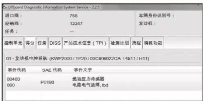 1 連接VAS6150B,通過(guò)自診斷查詢車輛電子設(shè)備,在“01—發(fā)動(dòng)機(jī)電控系統(tǒng)”中有“燃油壓力傳感器、電路電氣故障”存儲(chǔ),如下圖所示。