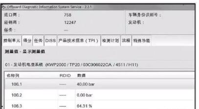 2 連接VAS6150B,在“01—發(fā)動(dòng)機(jī)電控系統(tǒng)”中讀取106組燃油系統(tǒng)壓力值,發(fā)動(dòng)機(jī)怠速和3000r/min時(shí),106.2區(qū)測(cè)試結(jié)果分別是6.00bar和6.41bar,如下圖所示。