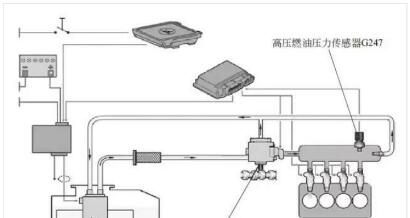 5 根據(jù)故障碼“燃油油軌壓力傳感器電路,電氣故障”,結(jié)合電路圖(下圖)進(jìn)行分析,故障的可能原因是燃油壓力傳感器G247及其線路故障或發(fā)動(dòng)機(jī)控制單元故障。