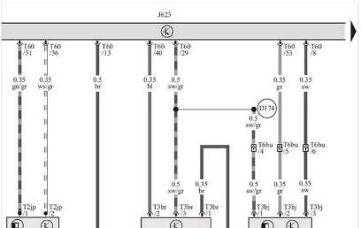 G28—發(fā)動(dòng)機(jī)轉(zhuǎn)速傳感器;G40—霍爾傳感器;G247—燃油壓力傳感器;J623—發(fā)動(dòng)機(jī)控制單元,排水槽內(nèi)中部;T2jp—2芯插頭連接;T3bj—3芯插頭連接;T3br—3芯插頭連接;T6bu—6芯插頭連接,在氣缸蓋附近;T60—60芯插頭連接;D103—連接3,在發(fā)動(dòng)機(jī)艙導(dǎo)線束中;D174—連接2(5V),在發(fā)動(dòng)機(jī)預(yù)接線導(dǎo)線束中