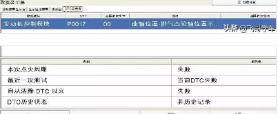 (1)外觀檢查未見異常,常規(guī)檢查機(jī)油液位等正常,用診斷儀GDS檢測(cè)故障碼(圖1),“P0017-00,曲軸位置與排氣凸輪軸位置不合理,缸組1”。缸組1指1、3、5汽缸。