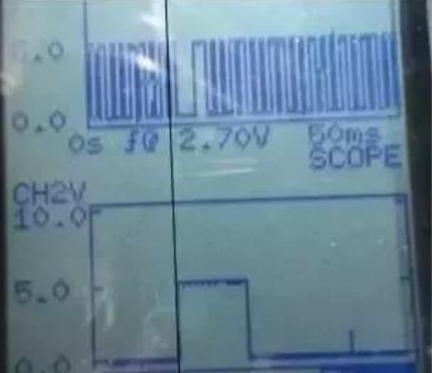 (7)安裝配氣機(jī)構(gòu)試車故障依舊,測(cè)量缸組1排氣背壓,怠速時(shí)壓力表指針幾乎不動(dòng),加速2000r/min時(shí)指示5kPa,背壓正常。懷疑ECM模塊噴油器信號(hào)有問題,ECM有一個(gè)65V的升壓電容,65V接至噴油器線圈正極,ECM控制各噴油器線圈負(fù)極,噴油器打開之后以12V保持開啟。測(cè)量ECM輸出的噴油器波形,正常。