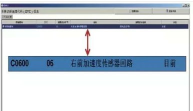 故障診斷:試車確認(rèn)故障現(xiàn)象存在,GDS檢測到“C0600 06 右前加速傳感器回路”,故障現(xiàn)象是當(dāng)前,如圖2所示。