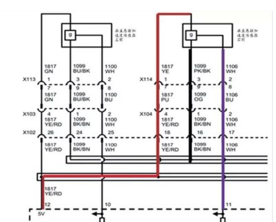 根據(jù)電路圖(如圖3所示)分析,點(diǎn)火開關(guān)打開ON擋,X114的1號腳與3號腳電壓為5V。