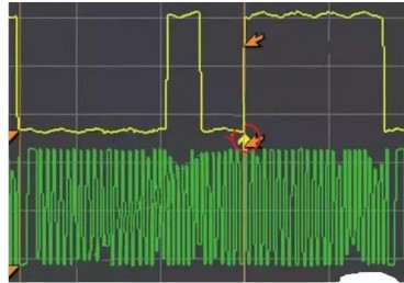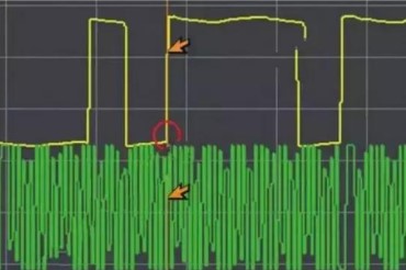 圖 4 中綠色為曲軸波形,黃色為凸輪軸波形。凸輪軸波形一個(gè)周期內(nèi)以?xún)蓪拑烧男问匠霈F(xiàn)。曲軸信號(hào)輪共 58 齒,第一個(gè)寬波出現(xiàn)在第 34 齒(如圖 5 所示)。