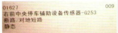 檢查分析:維修人員接車后確認(rèn)故障現(xiàn)象,掛入倒擋,停車輔助系統(tǒng)蜂鳴器常響,多媒體屏幕不顯示輔助系統(tǒng)監(jiān)測前后障礙物的模擬畫面。清潔雷達(dá)傳感器表面,無效。用診斷儀讀取停車輔助系統(tǒng)的故障碼,顯示故障為“右前中央停車輔助傳感器斷路/對地短路,靜態(tài)”(圖1)。用手觸摸各個停車輔助傳感器,發(fā)現(xiàn)除了右前中央停車輔助傳感器沒有振動感外,其他傳感器全部正常?;九懦\囕o助系統(tǒng)控制單元故障的可能。