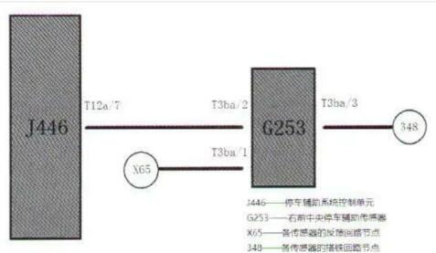 根據(jù)故障碼的提示,進(jìn)一步懷疑有可能是右前中央停車輔助傳感器本身或線路存在問題。根據(jù)右前中央停車輔助傳感器的電路圖(圖2),檢查傳感器G253至停車輔助系統(tǒng)控制單元J446之間的線路。檢查時發(fā)現(xiàn),傳感器的T3ba/2端子至J446的T12a/7端子之間線路有時出現(xiàn)斷路,有時還會出現(xiàn)對地短路的情況。拆開前保險杠發(fā)現(xiàn),傳感器該段線路的絕緣層已經(jīng)磨損,露出金屬電線。