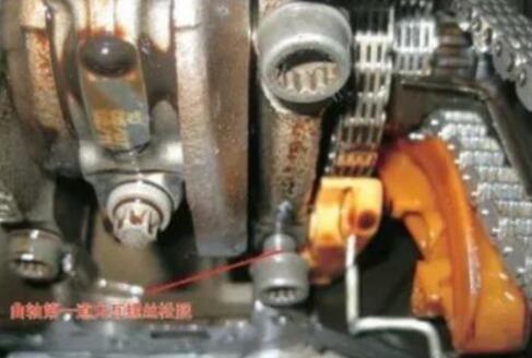 維修站的維修技術(shù)人員首先試車啟動(dòng)發(fā)動(dòng)機(jī),發(fā)現(xiàn)發(fā)動(dòng)機(jī)啟動(dòng)瞬間有“嗒嗒”的響聲,比正常發(fā)動(dòng)機(jī)的啟動(dòng)聲音要尖銳。維修人員將汽車舉升后掛擋位起步試車,異響較明顯,聽聲音好像是從發(fā)動(dòng)機(jī)與變速器連接部位產(chǎn)生的,判斷為飛輪的震動(dòng)產(chǎn)生的異響。但是當(dāng)維修人員更換新的飛輪后再次試車,故障還是存在。于是打開發(fā)動(dòng)機(jī)油底殼后仔細(xì)檢查,發(fā)現(xiàn)曲軸的一個(gè)主軸承蓋緊固螺栓松動(dòng)(如圖所示),造成曲軸軸承異響。維修人員更換螺栓并緊固后,試車,異響