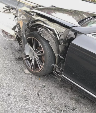 拱北交警梁警官迅速趕到現(xiàn)場(chǎng),看到事故發(fā)生在前山立交二層右轉(zhuǎn)匯入主道路段,賓利小車水箱爆裂,左側(cè)車頭保險(xiǎn)杠被掀起,上面還有好幾個(gè)大洞,地上都是碎片渣子。而停在幾米外的公交車,右后輪兩邊車身有長(zhǎng)達(dá)一米的刮痕。▼